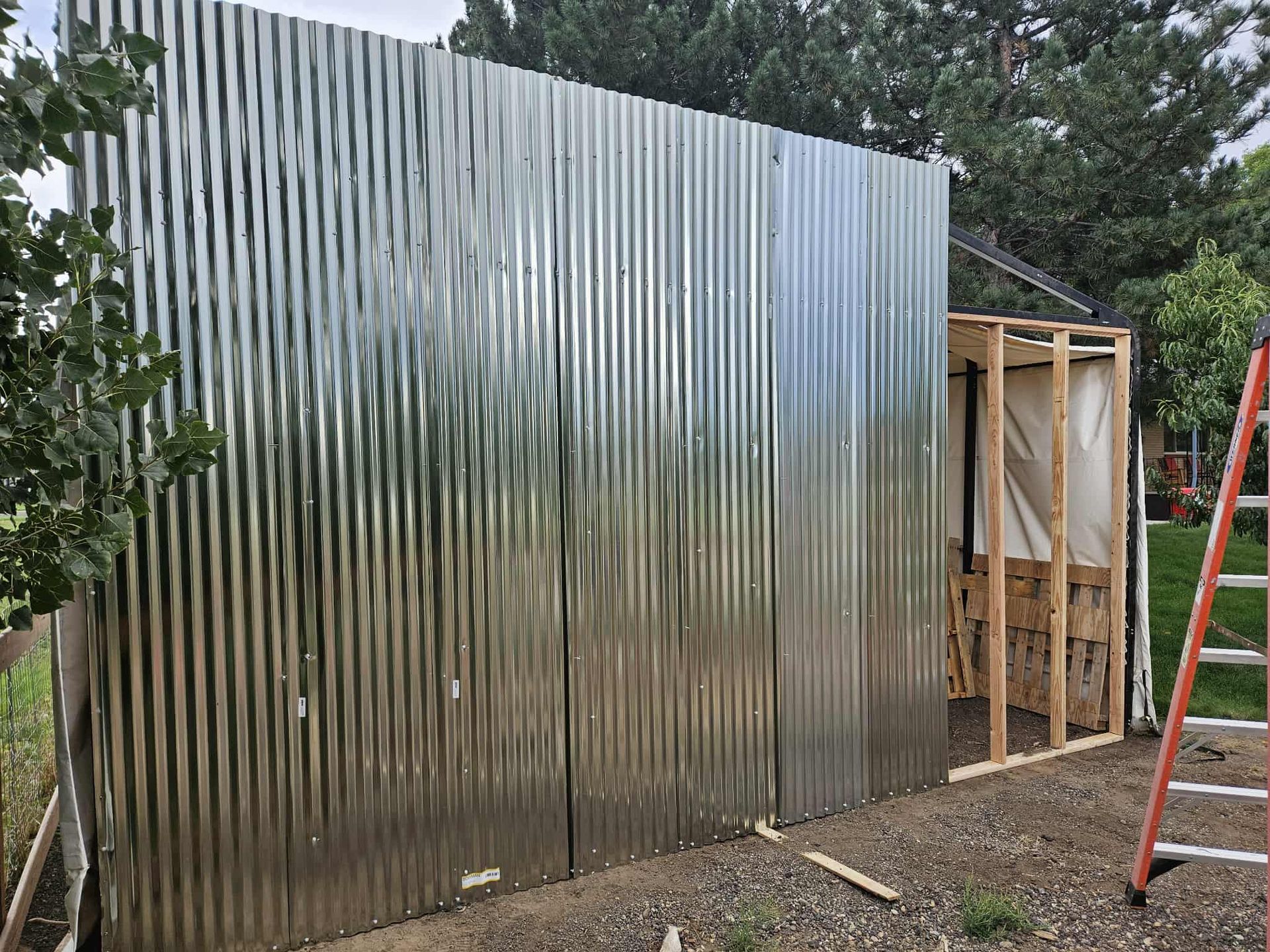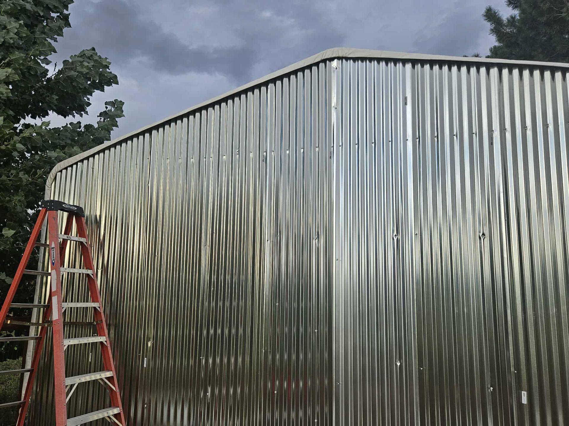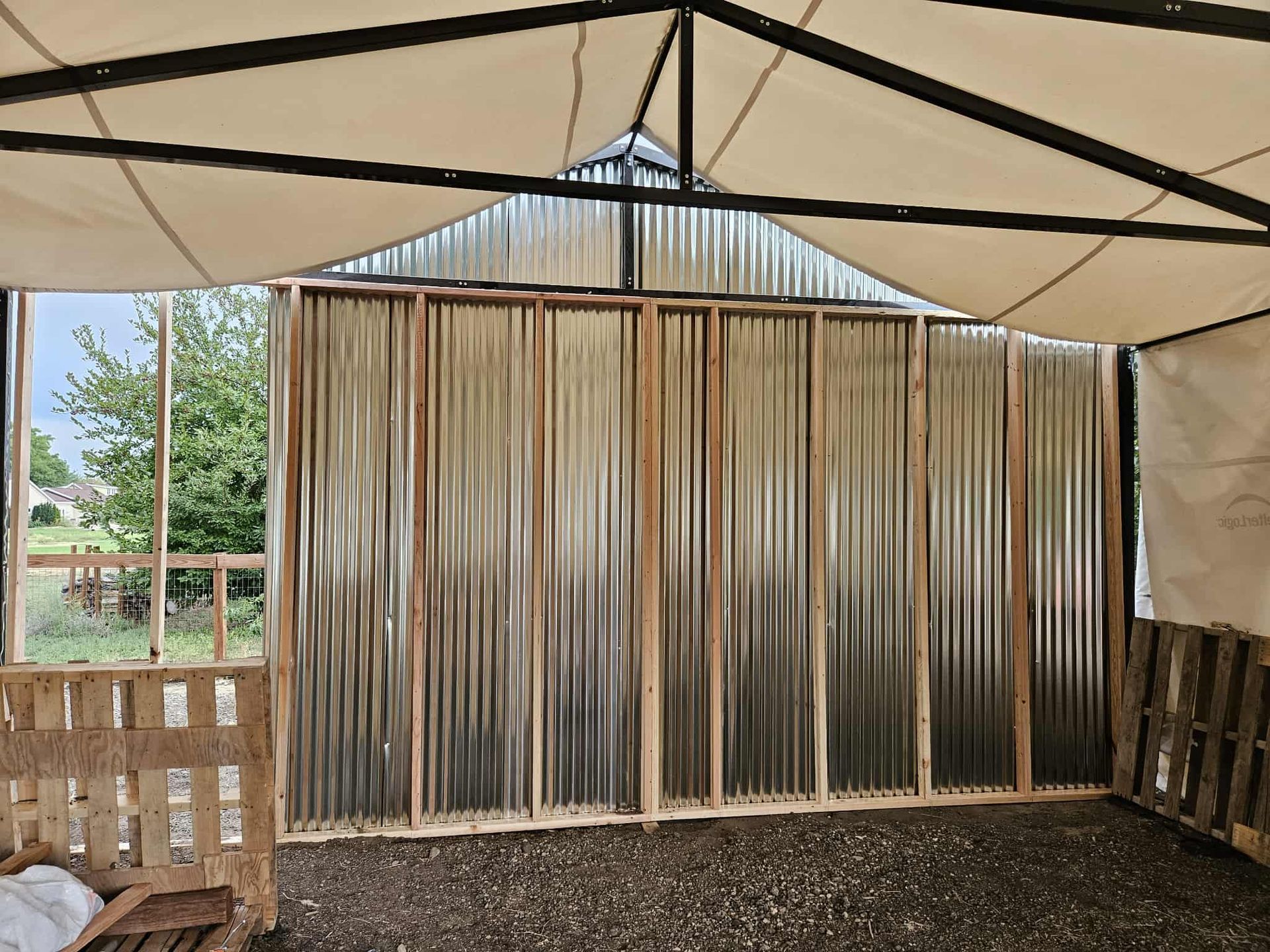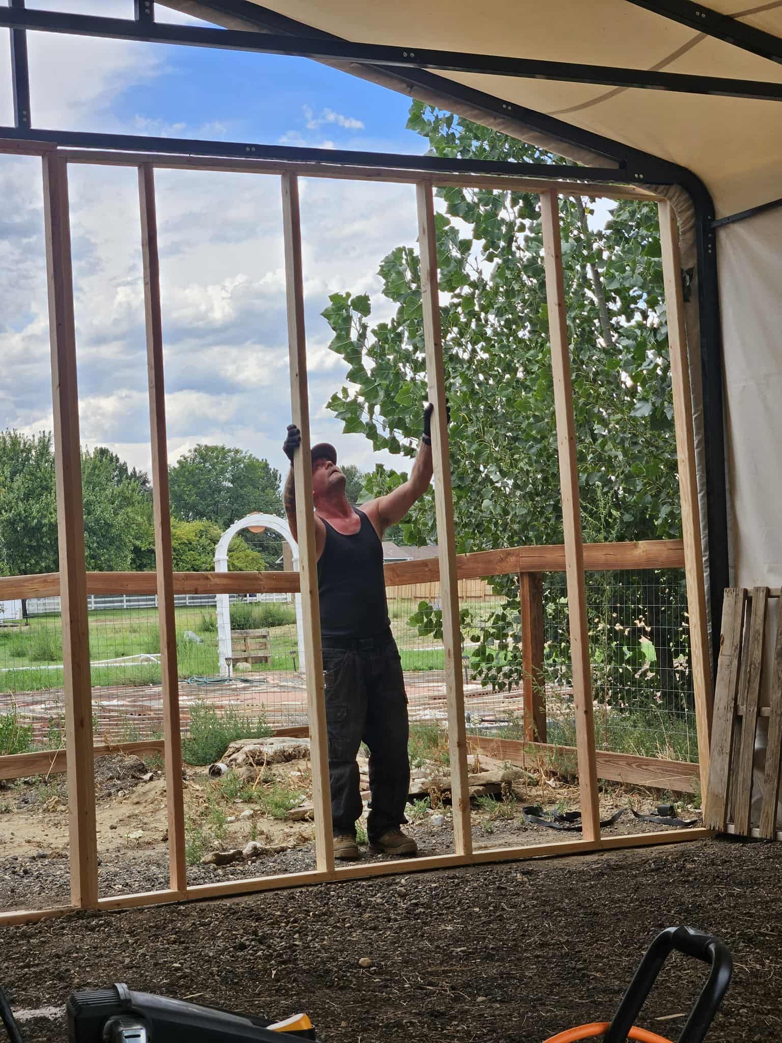 Dale Bowman Jr. completes a wall for the tent that holds the parade float/trailer.