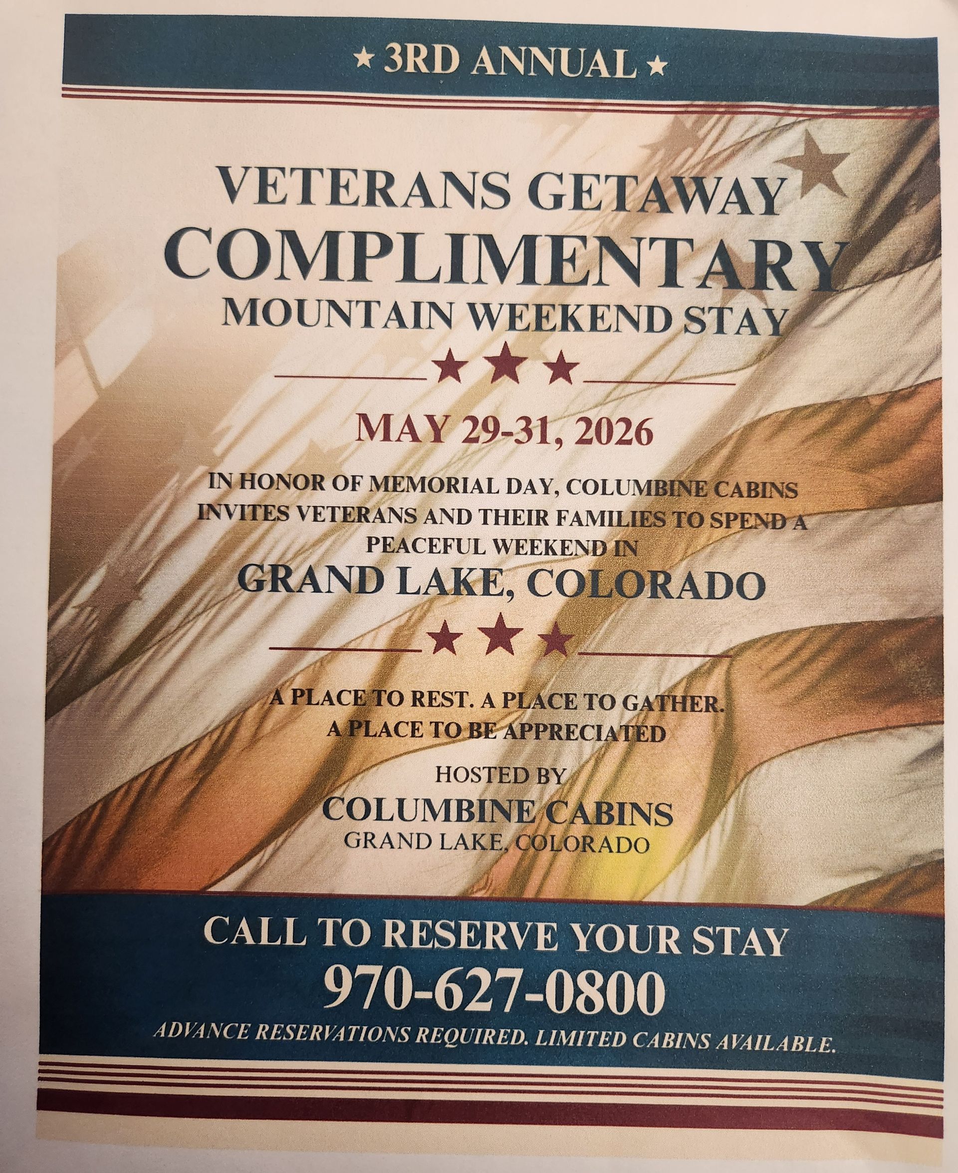 - The city of Grand Lake (located at the south entrance to the Rocky Mountain Park) is putting on a veteran celebration event over the Memorial weekend with free lodging/food and events. Call Veterans Getaway at Columbine Cabins 970-627-0800 to make reservations and get more details.