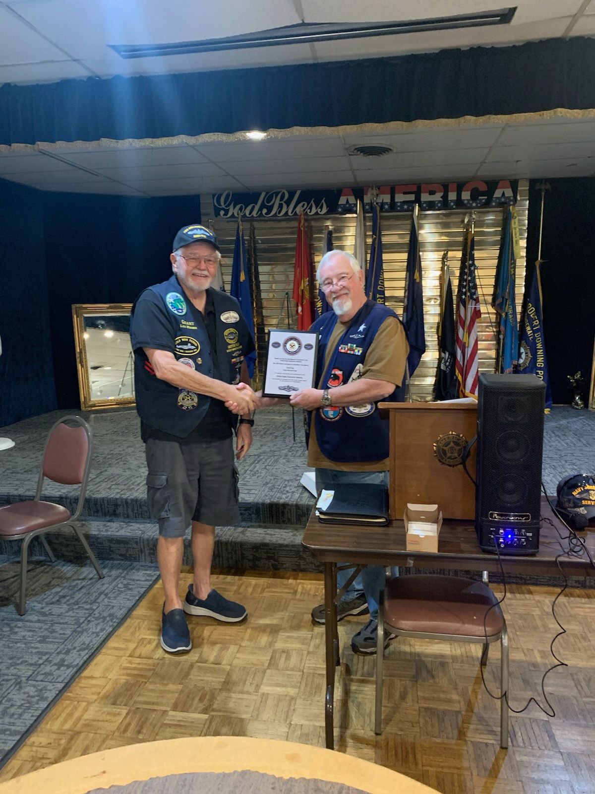 Now for the big event, we formed a committee to recognize and submit several of our members for USSVI National awards. One of our members won the National Robert Link award. As far as national is concerned, they project the award as equivalent to the Navy's Commendation Metal. And a well deserved individual won this award -- Grant Day. Please see photo below. We caught him totally by surprise.